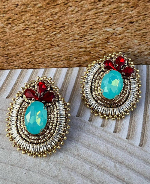 Eclectic Materials: “Opulent Odyssey Earrings” are a fusion of beads, fabric, and crystals, creating a unique and visually stunning accessory.